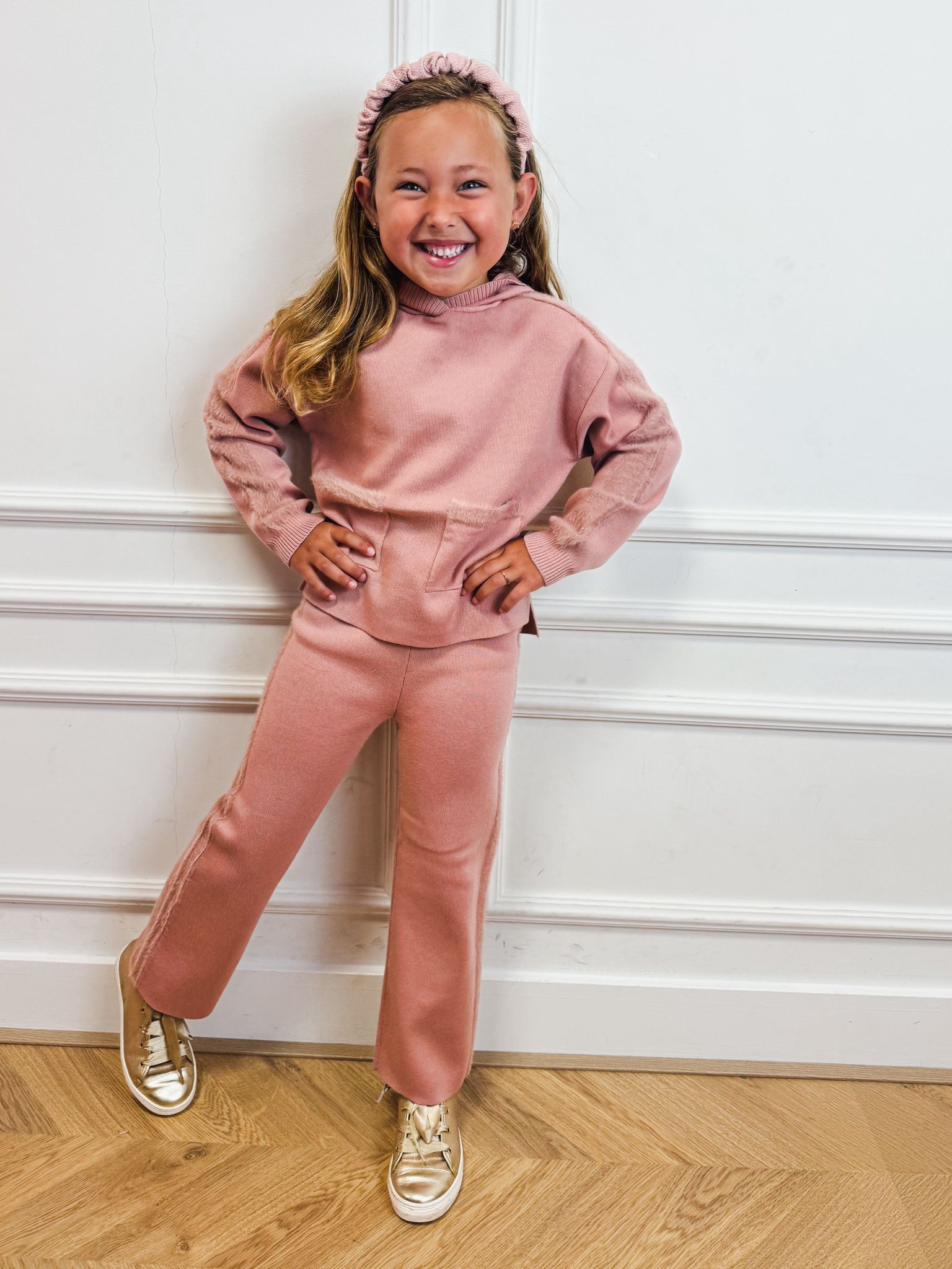 Set van twee delen: gebreide top en broek in bijpassende roze tint